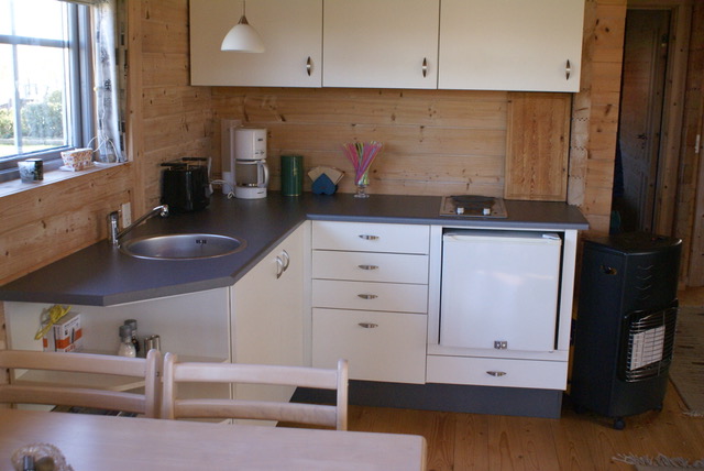 Hytten har 2 kogeplader, køleskab og mikroovn samt toilet og bad.